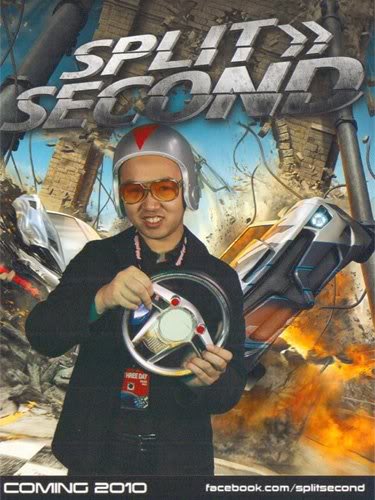 Going solo once again, I walked by the booth for the driving game Split Second and was asked if I'd like to get my picture taken. I agreed, stepping inside the booth and getting in front of the special screen. They gave me some props to put on and took the picture. Boy, do I look ridiculously stupid in this photo! I wonder why my shirt sleeves turned green since I was actually wearing a brown shirt.