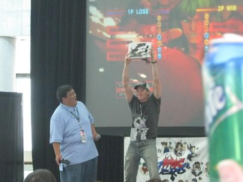Andrew had to go to work, so Anthony and I stayed behind to watch a special Street Fighter 4 event for charity. Six people won auctions for the chance to do battle with Reuben Langdon, the voice actor who potrayed Ken Masters. If they won, Reuben would record a personalized voice message for their phone and they would also receive a signed lithograph of Ken. Five of the winners defeated Reuben's Ken. The sole loser, who used Ryu, lost a very close match. No offense to Mr. Langdon, but I think I had a pretty good chance of winning some prizes if I had paid up the money.