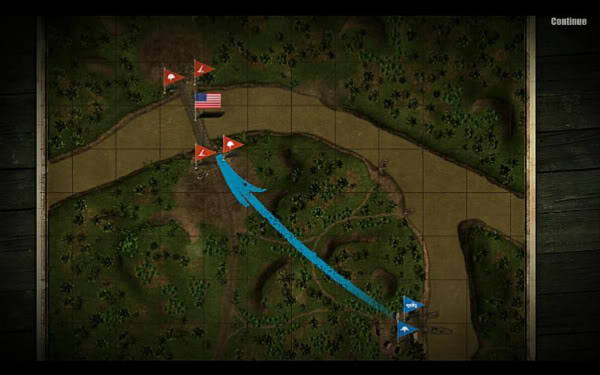 With the bridge secured, we now have a defensible position to hold back the U.S. forces coming up from the south. We ready our looted single-shot bazookas, mortars, and MG nests. As the enemy armor breaches the muddy ground in front of the tree line, a distorted guitar playing a menacing riff swells in the background.