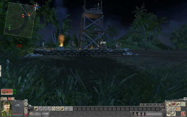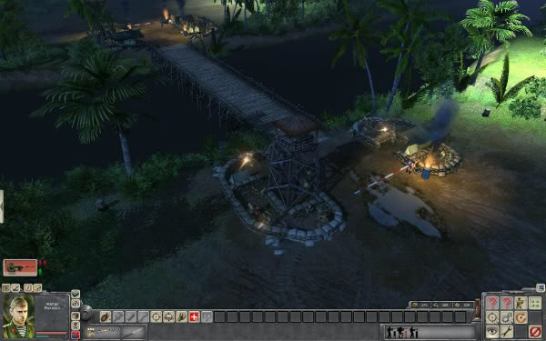 The Americans have dug in deep around the overpass: Sandbags protect two machine-gun (MG) nests and offer cover to soldiers equipped with M-16s and mortars. In light of this, we decide to sneak through the jungle, swim across the river, and launch a surprise attack from the other side of the water.