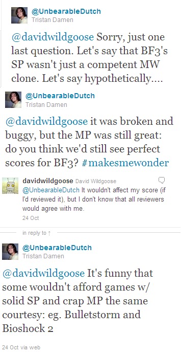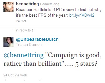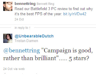 It all started with an innocent tweet from GameSpy editor, Bennett Ring. I read the review as instructed, but had some questions once I'd read it all, and saw those five (out of five) stars. As above, a perfect score when justified is fine, but when I read "campaign is good rather than brilliant," "much of what's new is familiar," "BF3 is a flawed game," I thought that some questions were in order. To his credit, Bennett answered the first one, but understandably - the response was pretty defensive, and didn't really address the issue. That is, the writer's challenging the definition of what perfect is.