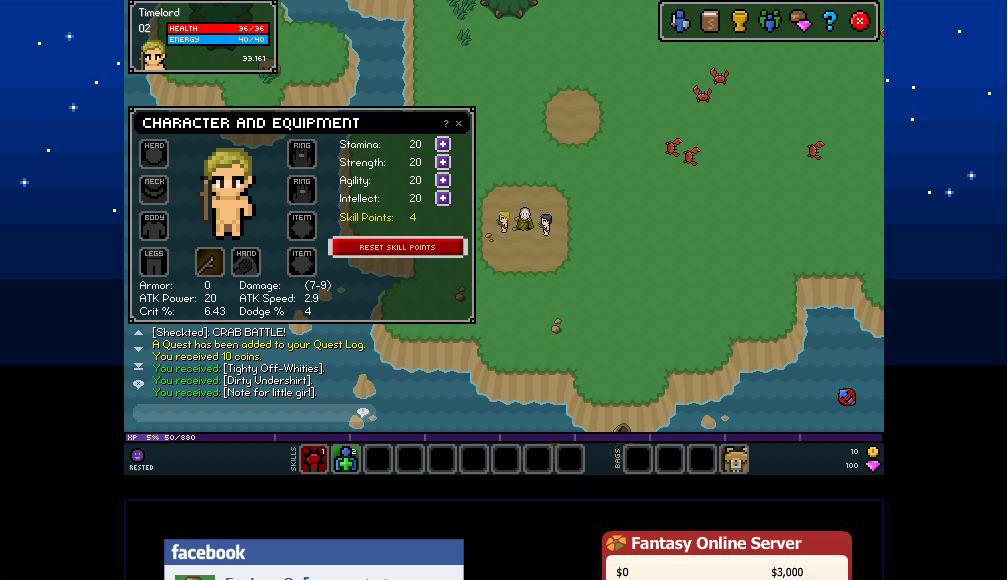If this game had come out six or seven years ago, xBlazeUK (the 15-year-old creator) would be a very rich programmer. Fantasy Online is a flash-based MMO that has the quaint look of a classic Final Fantasy or Zelda game, but incorporates more than a few elements of World of Warcraft. There is equipment to be had, currency to earn, and quests to complete. The quest givers have an exclamation point over their head which switches to a question mark when the quest is complete. You earn levels and delegate skill points as you see fit. It's really an amazing piece of work.