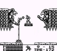 Graphics & Design: The game looks really good. Not quite as good as the NES games but still very good considering it is on Game Boy. The levels are designed well and have that gothic and eerie atmosphere that the Castlevania series is none for. I also like the different variety of levels this time around with the four castles (cloud, crystal, rock and plant). I find that they give the game an additional otherworldly feeling. But I am a tad disappointed that the game doesn’t offer up many of the traditional monsters that we are used to seeing from the series. Sure we get bats, crows, skeletons and even a few grim reapers but mostly the creatures are more gothic in origin like gargoyles and goat like demons or are just plain weird like toad things that bounce around, giant bugs, spiders, giant rolling eye balls and reptile heads that shoot fireballs. These enemies aren’t bad but it would have been nice to see some of the more familiar monsters.