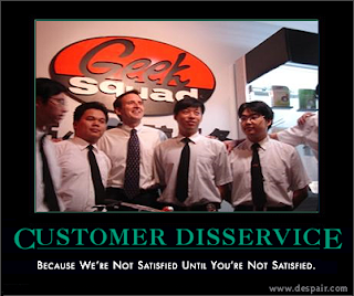 So, I took my phone into Geek Squad and after waiting in line for almost an hour to talk to someone, the guy told me that it could take up to 1 month to fix (Strike 1). He assured me, though, it shouldn't take that long; that it usually takes about 2 weeks tops because the repair center is right down the street. Hm mm.... Best Buy doesn't do in store repairs? Okay, so 2 weeks was okay I guess because it needed to be fixed. I asked for my temp. phone and they asked me for a 150.00 deposit for this temp phone! Um mm.... "but the cute little high school girl said I wouldn't have to pay anything for the temp. phone" (Strike 2). Ugh, I left my phone anyway hoping that it would only take the 2 weeks to fix since the repair center is, of course, right down the street. Well, today is the 21st of July and I still don't have my phone. I called them and the girl who answered told me that if my phone doesn't come in by the 28th (the date they promised me it would be back) that they would put in an escalation request for it to be repaired. Um... Strike 3. They are about out! What makes me cringe at this whole thing is, after Best Buy ganked my phone from me, I found out that if I took it into a Verizon repair center I would have got a whole new Droid 2 days later. http://itsgrindingmygears.blogspot.com/