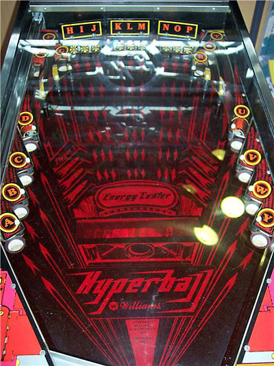 He tried explaining Hyperball to me but I was sort of lost, so I just started to play. Housed in a pinball cabinet, Hyperball is anything but a pinball. The center of the playfield is empty, and instead of flippers there are two triggers that launch a volley of balls out of a cannon at the center. All up the edges and across the top are holes labeled with different letters of the alphabet. Lightning will began traveling up either side from hole to hole until it reaches the nine letters across the top. At that point it will shoot down the center from any one of these spots toward your 'energy center'. If you didn't cut off the lightning, by shooting a ball into one of the holes while it was still there be it on the sides or at the top, it would hit your energy center, and you would take damage.