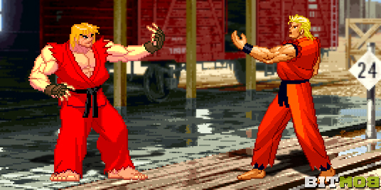 Ryo's orange gi looks very reddish in Art of Fighting 3, making the kyokugenryu karateka appear way too much like Street Fighter's Ken Masters. At least Ken doesn't have a mullet.