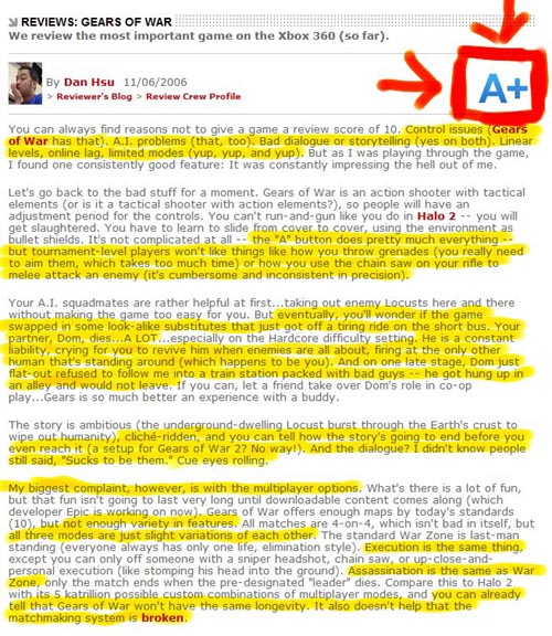 Shortly after I reviewed the original Gears of War for EGM/1UP, someone took a screenshot of the article, highlighted all the negative things I brought up about the game, circled the score (which was originally a 10/10, then got converted to an A+ when we went to a letter scale), chopped off the second half of the text where I justified that very score, then used what was left as an example of what an idiot of a reviewer I was.