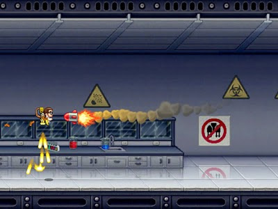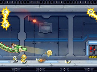 Wretched score - The singular piece of original music in Jetpack Joyride is more exhausting than elevator music and doesn't really match the black comic sensibility of the action on screen. This can be made a null point by simply playing your own music while running the game, but still, fairly underwhelming considering the addictive qualities of the play and presentation.