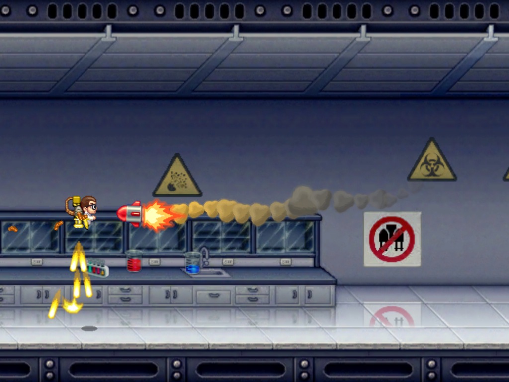 Violent, vehicular whimsy - As you're avoiding obstacles in the titular jetpack - or any of the aforementioned vehicles - I'd challenge you to do so without a sadistic grin on your face. Raining bullets on hapless scientists, trampling them with the Lil' Stomper, or burning them with Mr Cuddles (a robotic dragon) is nothing short of a responsive joy. The retro-flavoured visuals were also cause for delight and - despite the lack of variety - only added to the game's charm.