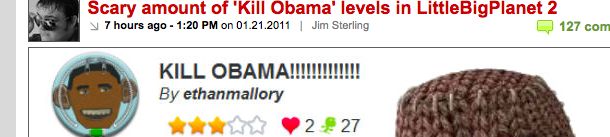 Why contribute a paragraph explaining the possible motives behind the ignorance in LittleBigPlanet 2? It might not even be the reason why these people created the levels. I think most people do insensitive things online for shock value in hopes that journalists like yourself give them exposure. If you really had a problem with the levels you would have simply reported it, or at least called out the people who created the levels. You didn't mention any of the level creators once in your article. All you did was open the flood gates for more people to make Kill Obama levels in hopes that you'll write a story about them.