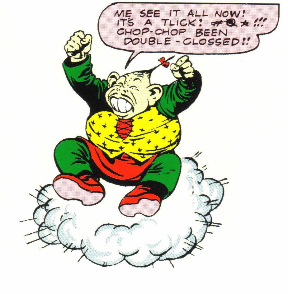 I was disgusted. The name "Chop Chop" appears to be a reference to a comic book character from the '40s and '50s. As you can see in the picture on the right His image was that of a stereotypical Chinese caricature. It's insulting to for a game to take pride in killing a bunch of characters rewarding the player with a shout out to an offensive character.
