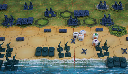 Combat is resolved with special dice that have two infantry symbols, one tank, one grenade, one flag, and a star. You roll a certain number of dice based on distance (artillery and infantry roll less dice on a target the farther it is), the defenders terrain, and any bonuses from tactics cards. The defending unit is hit by dice that match their unit symbol or grenades: my tank attacks your infantry that are on top of a hill two spaces away, I roll three dice, minus 1 for hill defense; infantry and flag; your guys take one hit retreat one space towards you. Pretty simple stuff.
