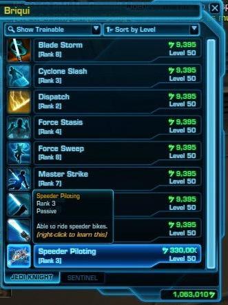 Aside from being able to pay for gathering missions, some of the in-game goods on the market are ridiculously expensive. Speeders (The Old Republic’s version of mounts) range anywhere from 20,000 credits upward to 1.5 million credits. This is fairly reasonable. What is not reasonable is the cost of the skills to be able to use said speeders. The first rank of speeder piloting is available at level 25, at a cost of 40,000 credits, and it provides a 90 percent speed boost to the player’s movement. Rank 2 speeder piloting becomes available at level 40, and costs 210,000 credits. It only boosts the top speed up 10 percent from Rank 1 to a 100 percent boost. Finally, Rank 3 speeder piloting costs 330,000 credits, and it only adds a meager 10 more percent speed boost, for a total speed increase of 110 percent.