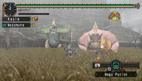 The first quests I did, Triumvirate of the Sands (Daimyo Hermitaur, Tigrex and Plesioth) was only a five star quests and made easier by having to fight three monsters who all share the same elemental weakness, thunder. My shiny new Wailing Cleaver Shin made short work of the lot of them, to be sure. Baby Boom! Flocking to Sleep was ust another multiple Hypnoc quest. Nothing special there. Expunge the Funk!, on the other hand, was nightmare. I already expressed my hatred of the Emerald Congalala a few weeks ago, and fighting it alongside another Conga was not my idea of fun at all.