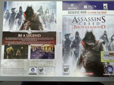 A leaked image of a GameStop shelf placeholder card has revealed the name of the next Assassin's Creed game. Kotaku received confirmation by Ubisoft that Assassin's Creed: Brotherhood is indeed the official title after a GameStop employee posted pictures of the placeholder card on the Internet. Additional information provided by the card indicates that Assassin's Creed 2's Ezio will return, this time within the sprawling capital of Rome. The brotherhood in question refers to the band of mysterious assassins that lurk behind Ezio on the front and back cover, which teases the brand-new multiplayer component being introduced within the game. As for the GameStop employee, can you say, "hosed"?