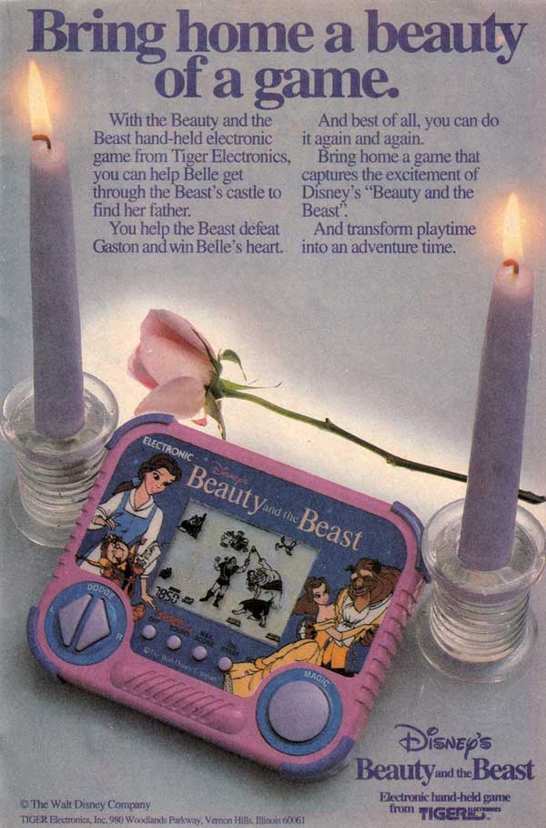 Beauty and the Beast was, as you might expect, absolute crap. My purpose in showing this girly thing to you burly Bitmobbers is to point out the utter ridiculousness of the ad. It's all done up in lavender, and the candle holders are perhaps the worst leftovers from the early '90s I've ever seen. Ads like this are responsible for the lavender and pink color mixture that plagued girl accessories, rooms, and clothing for nearly a decade.