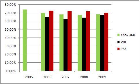 Microsoft is a little all over the place, but I can suggest that the trend toward higher percentages of "bad" games suggests that lower quality titles are being produced on the cheap to take advantage of the large install base. Alternatively, this is evidence that review standards get higher the further along in a console's life cycle. You'll also notice no data for 2005. This was due to the fact that no games for the Xbox 360 had a score lower than 40%.