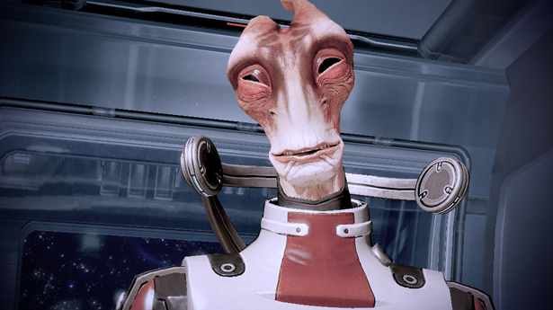 Now, because my alternate character had lost Wrex, I’m stuck with his unreasonable brother, Wreav. Wreav would turn the Krogans into a galactic menace, so it's easier to agree with the Salarian politician. But Mordin -- a Salarian scientist seeking redemption for helping to develop the genophage -- would rather die than let me fool the Krogans. Mordin’s moral struggle with his and his species’ role in the genophage was a huge side plot in Mass Effect 2. He even rewrites human showtunes to be culturally relevant to bug-eyed space aliens from the future.