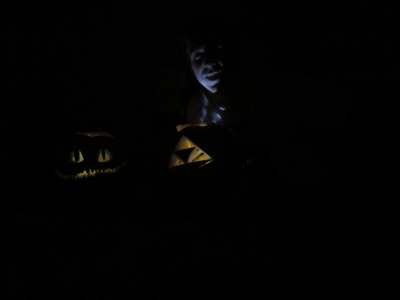 The back of my girlfriend's pumpkin on the left and mine (Triforce) on the right in the light.