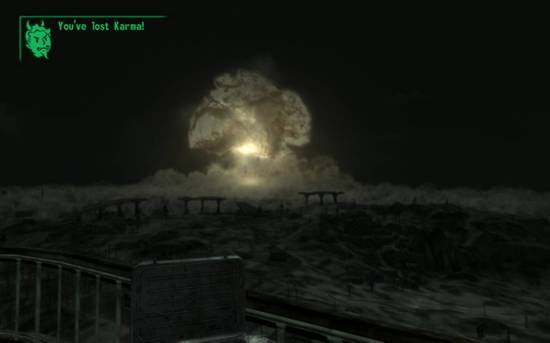 Despite my criticism of Mass Effect 2, it still does remarkably better at creating effective choices and consequences than, say, Fallout 3. And why? Because Fallout 3’s morality choices come with instant consequences that are easy to predict. For instance, if you were to blow up some innocentwastelanders, there would instantly appear a little “You’ve lost karma” in the upper left corner of the screen, instantly letting the player know that what they did was bad. Of course, you could claim that ultimately the players’ actions in the Wasteland has an impact on the ending, which is true, but instantly manifesting the players’ actions with an arbitrary numerical score only allows the players to essentially choose which ending they desire. The players can then calculate how many “bad” and “good” deeds they need to make to get the desired ending, especially when the game has been marketed as having “multiple endings!” I’m not advocating that future projects necessarily should scrap the numerical system for creating consequences, but at the very least hide it.