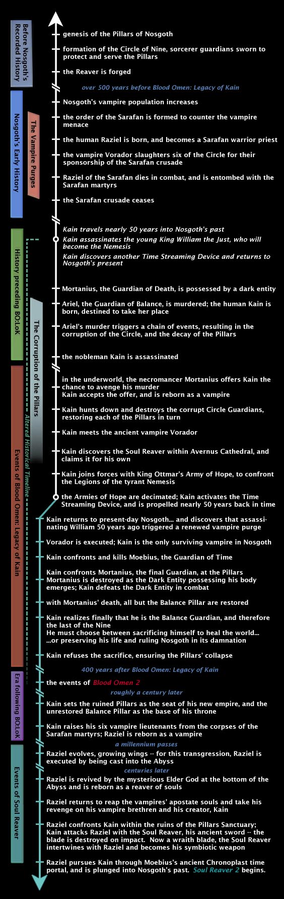 Despite the time-hopping shenanigans of the rest of the series (the timeline of the first two games can be found here, and it only gets more complicated after that), Soul Reaver is a straightforward action-puzzle game in which the newly-wraithified Raziel slashes, impales, crushes, and burns his way through his vampire "brothers" and their minions in his quest to avenge himself upon Kain for the loss of his wings, jaw, skin, eyelids, underlings, and time.