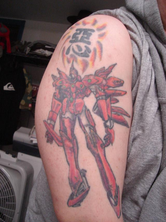 I picked up this tattoo of ID from Xenogears after my first tour in Iraq. The "evil" kanji symbol had been there from before and ended up accentuating the gear.