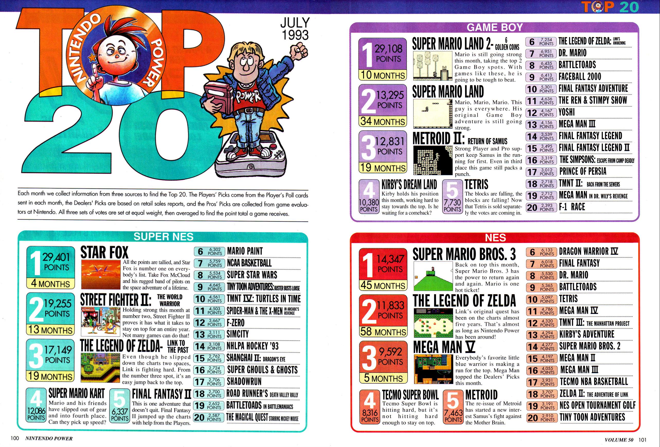 For our Top 20 this issue, Star Fox now holds the top spot on the SNES, bumping down Street Fighter II (original version) and Legend of Zelda: A Link to the Past. On the Game Boy, Super Mario Land has once again been bumped off the top spot, and not by Metroid II. Instead, Super Mario Land 2 has claimed the top of the charts, pushing Samus and Kirby further down the charts. On the NES, Mario 3 retains the top spot, followed by the original Legend of Zelda (who has been on the Top 50 for the magazine’s full run), and Mega Man V. It bears mentioning that every NES Mega Man game is on the charts and every Metroid game released as of this issue is on the charts. We are missing Zelda 2 from the charts on that franchise, and the original Super Mario Bros and Super Mario World are absent from the charts from that franchise.