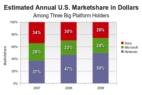 As a PS3 owner, I am pretty psyched for this year and the plans that could either result in an amazing corporate comeback or a hilarious 'Iggy Shuffle' into obscurity. Its no secret that Wii's sales have slipped and the Xbox 360's exclusive line up for 2010 is still questionable. However, according to that bar graph that I didn't make, those companies need not do anything of worth and could still hold their ground thanks to Sony's ability to trip over their own products in the handheld market. I love technological creativity. I also understand the 'need to be first' and barring Blu-Ray, Sony has been playing catch up with the casual community for the past couple of years. Sony lackeys, I am a fanboy of all systems and none at the same time. I got high hopes for the independent games market on PSN and though I am baffled by the people who spend money in Home, I am glad you found a base that seem to be blindly supplying that project. This generation has a ways to go and mistakes are unavoidable in the tech business, you have to be able to predict what the people want years in advance. Sony, if you think people want magic wands and 3D glasses playing on televisions more expensive than their cars, then I beg of you to prove me wrong.
