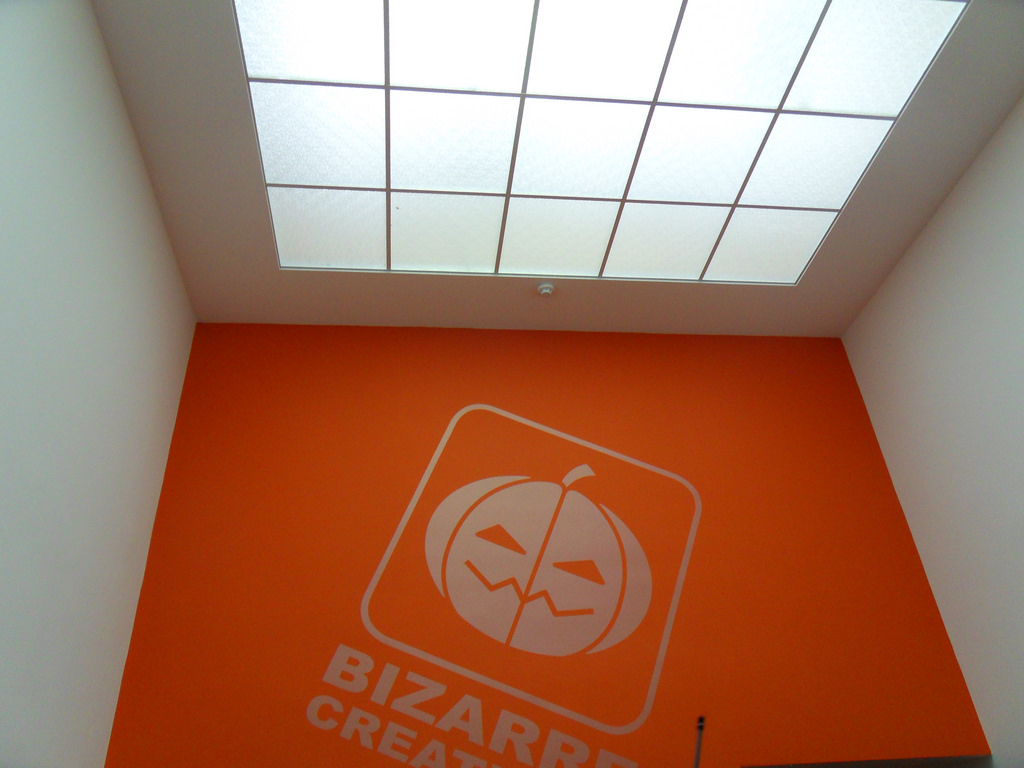 This company logo is painted above a doorway in the main hallway. I'm not sure if the pumpkin is smiling because he's happy or because he's up to something. Probably the latter. I don't trust that guy at all.