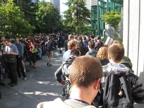 On Friday morning, I drove my friend Nolan to Seattle's recently opened light rail station and met up with my longtime convention accomplice Jon. After I bought our passes, I placed mine in my pocket as we boarded. A somewhat frightening moment happened when my pass disappeared during a police ticket check, but luckily Jon found it right when I was asked to step off at the next stop. The officer even seemed relieved and said that this was a close one! Anyway, we reached the expo and got in line, which was outside this year.