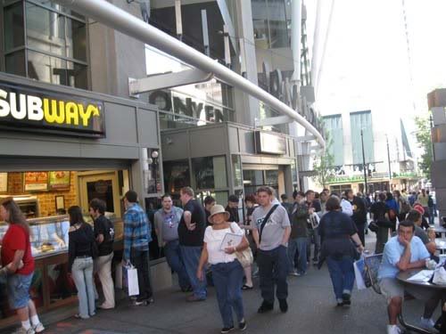 I needed to relax my arms, so I went outside to wait for Charles. The streets were already filled with attendees, including many that were already hungry for lunch. After about a 30 minute wait, Charles arrived and relieved me of my TE stick burden. Thank goodness!