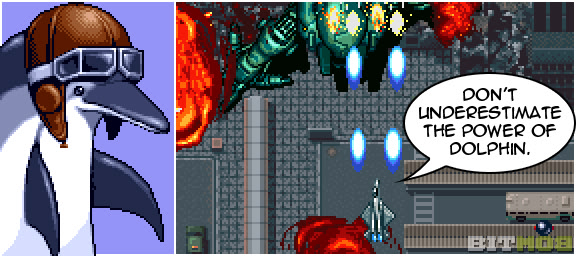Meet Aero Fighter 2's Spanky. I would really, really like to know how this marine mammal got a pilot's license and certification. Not only is Spanky a f***ing dolphin, but he also speaks fluent Engrish. Enjoy some inspirational quotes from the bottle-nosed hero: