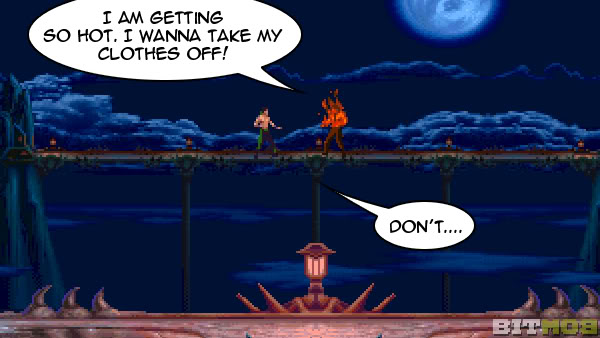 I am aware that Mortal Kombat's plot is ridiculous, but at least the developers tried to explain characters' pasts, their mythology, and the culture of each realm. However, the stage called The Pit II from Mortal Kombat 2 holds a hot, little mystery...a freaking guy on fire in the background.