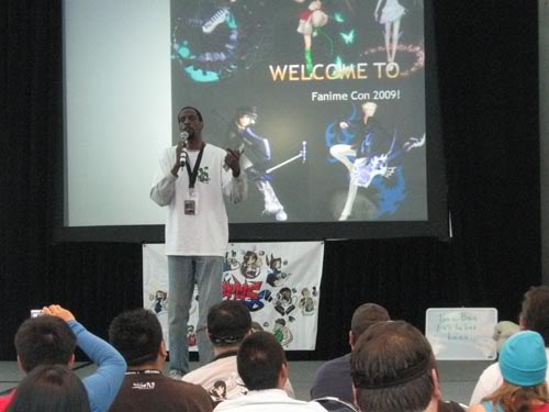 After watching a few minutes of the Initial D anime and growing bored, we resumed wandering around the second floor. Around this time, we stopped to watch parts of the opening ceremony. Fanime's special guests were introduced, like Japanese performer Momoi. Several Capcom voice actors were making appearances at the show, but couldn't make it to the ceremony since they were working on a top secret project. I wonder what it is...