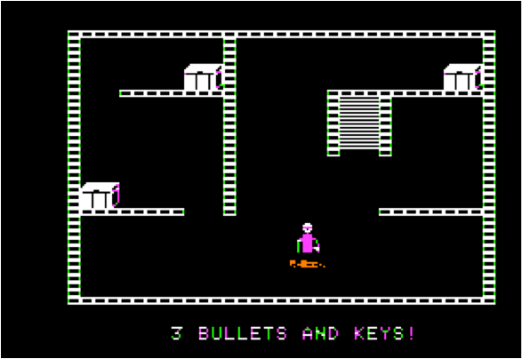 One of modern stealth game's common ancestors is Castle Wolfenstein (Muse Software, 1981), originally released for the Apple II computer. In the game, participants must progress through a series of rudimentary corridors with the aim of reaching end zones and collecting secret war documents. Standing in the way of these exits are patrolling guards. The game arms the player with a gun, but ammo is scarce. Stronger enemy types take a considerably more ammunition to kill, which subsequently makes it increasingly difficult to win a gunfight. Dead guards leave behind ammo, keys, and bullet-proof vests.