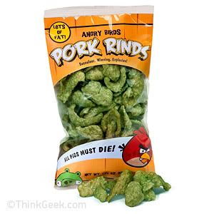 Do you like Angry Birds? Then you'll love these delicious Angry Birds Pork Rinds. They're green, just like the pig scum that made those birds so mad. That's not all Think Geek is offering today. Check out their site for more.
