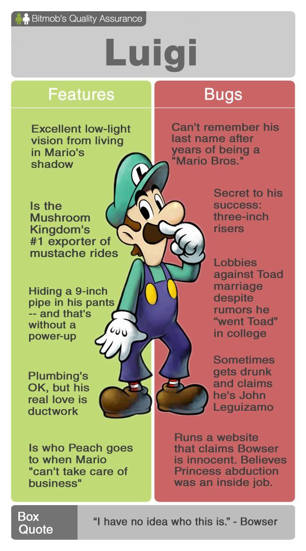 Luigi was always my number one character in Super Smash Bros. -- I think I felt sorry for him. After all, he is a really easy target. Which explains why we've chosen him for Quality Assurance. We're really into tearing down easy targets. Surprisingly, we got all the way through this without a single joke about what the plumber does with that Luigi's Mansion ghost vacuum in his spare time.
