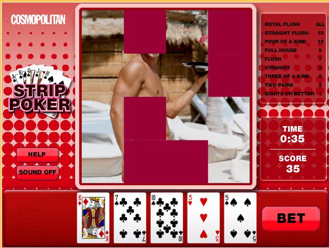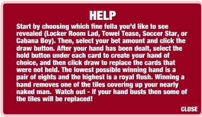 When you first begin to play a game of Strip Poker (found here) you're asked to choose the man who will strip for you. They have names like Towel Tease and look like boring, white-bread male models to me. I think I chose Cabana Boy but, as they all looked so similar, it was hard to tell.