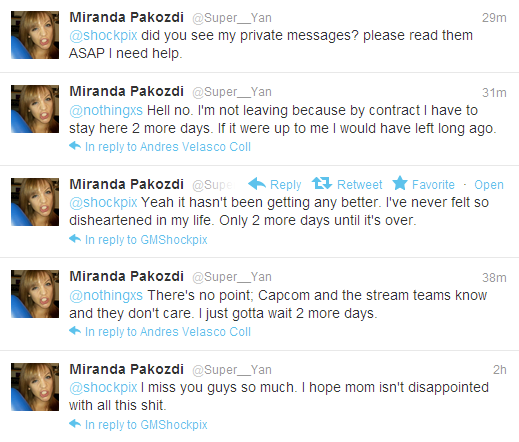 Giant Bomb obtained a screen capture of tweets from Pakozdi (@Super__Yan) including one relating her distress at Capcom’s apparent apathy. This particular tweet longer appears on her feed. She has also suggested in her tweets that additional inappropriate behavior occurred off-stream.