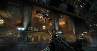 Old Blue Eyes - The score in Crysis 2 is about the best I've heard featured in a first person shooter. Save for one odd, aural inconsistency during the last firefight, the music perfectly matches the grandeur of the action unfolding on screen. The main theme has some sinister undertones which hint at the (predictable) betrayals that you suffer throughout the game, while the other pieces steel your hands for war. The multiplayer theme is perhaps the most inspiring piece of music that I've heard put to a loading screen. Sounds effects are also of high quality, with a few persistent blemishes. Specifically the suit makes some pretty heavy and annoying sounds while moving. Sometimes I managed to freak myself out, hearing enemies that weren't really there. Otherwise, all of the guns, aliens and their technology sound pitch perfect.