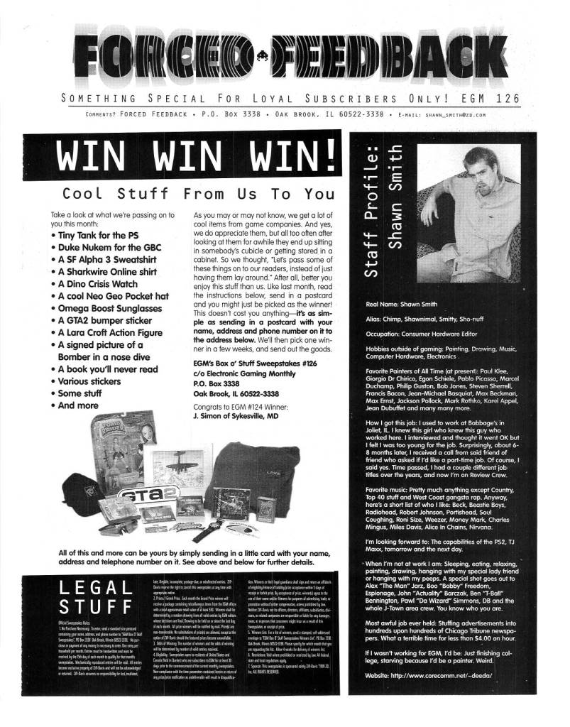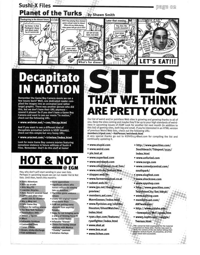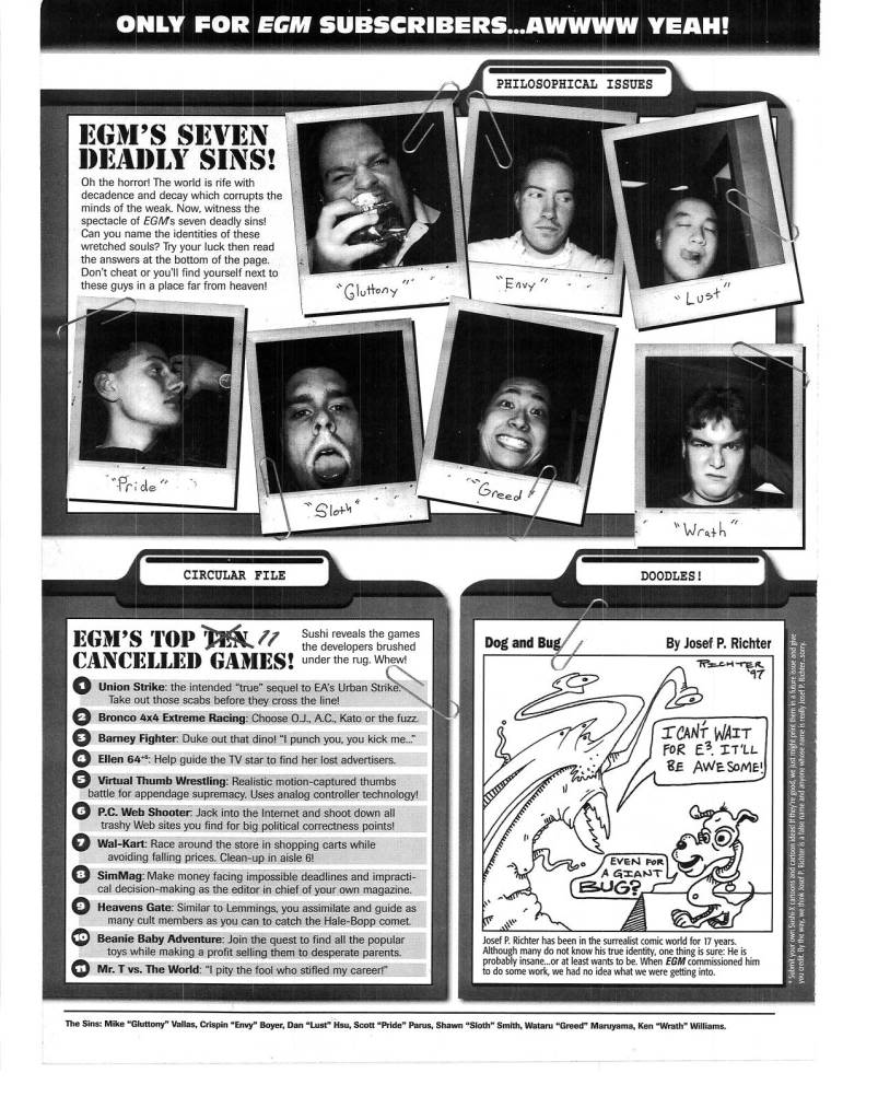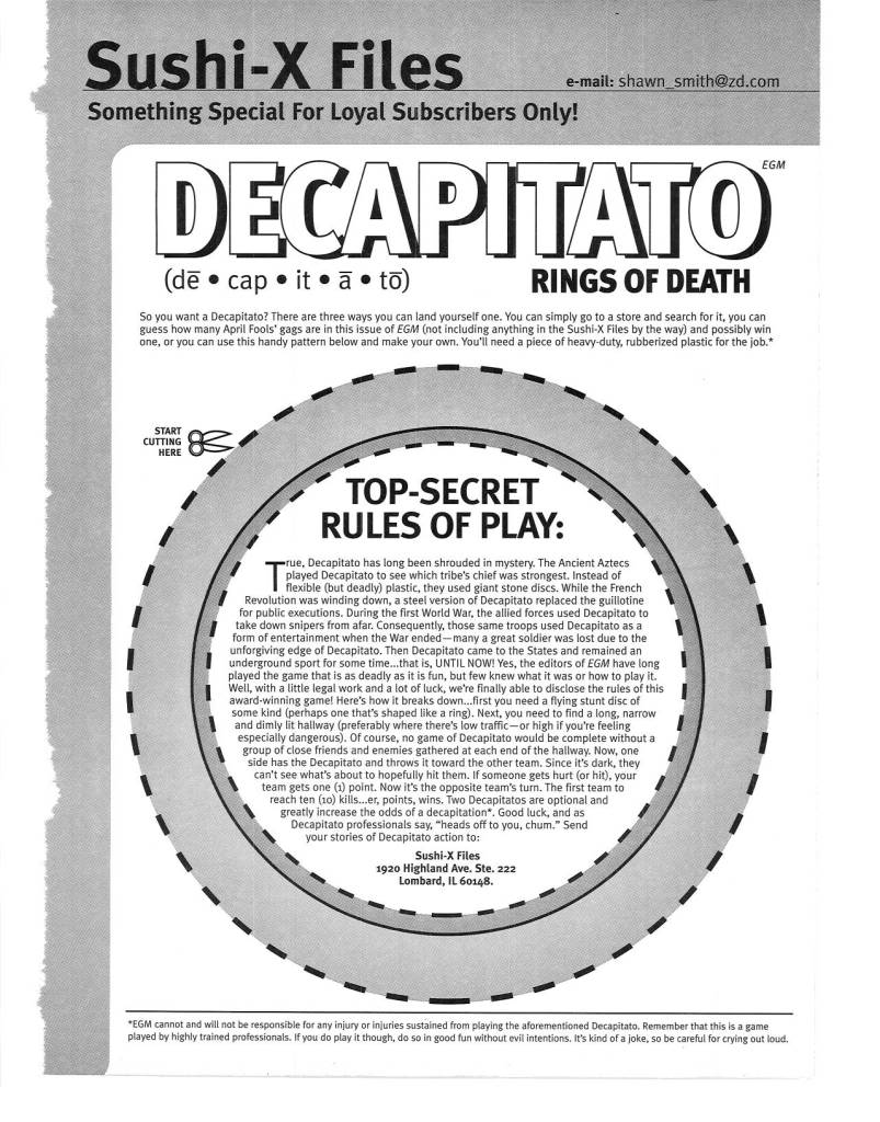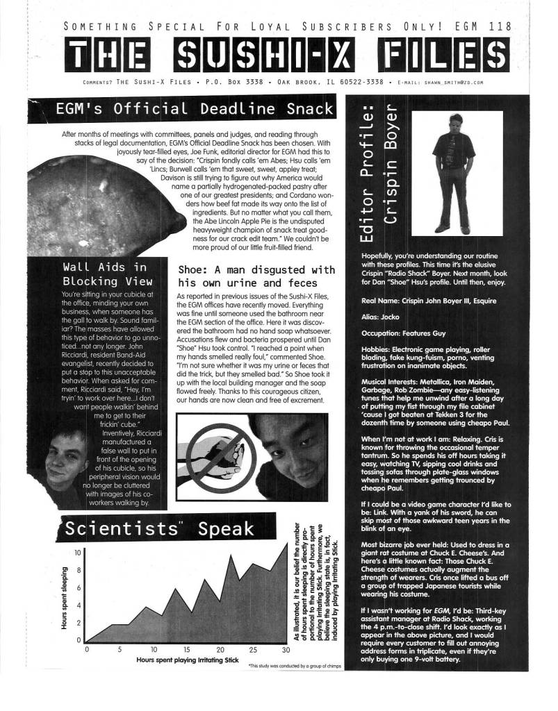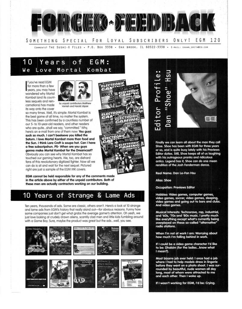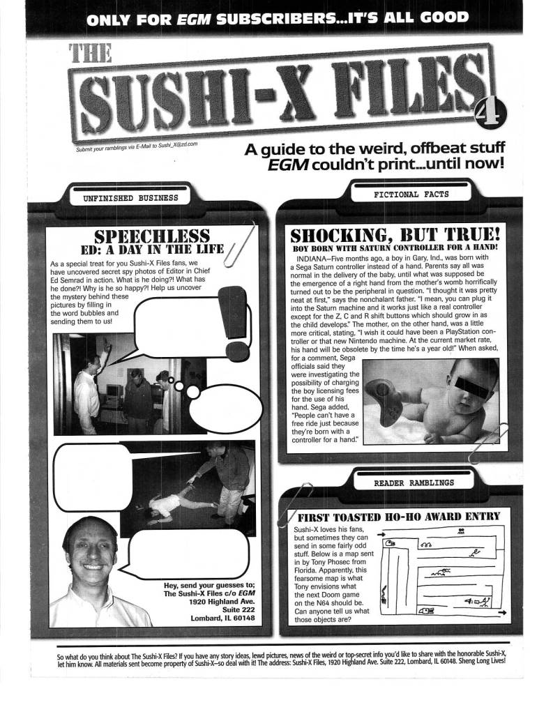 Another thing that separated EGM from the rest was the cool things they would go out of their way to do for their loyal subscribers. Cool extras like posters, stickers, move lists, mini guides, etc. were always appreciated, but what I always loved were “The Sushi-X Files” inserts, later known as “Forced Feedback.”