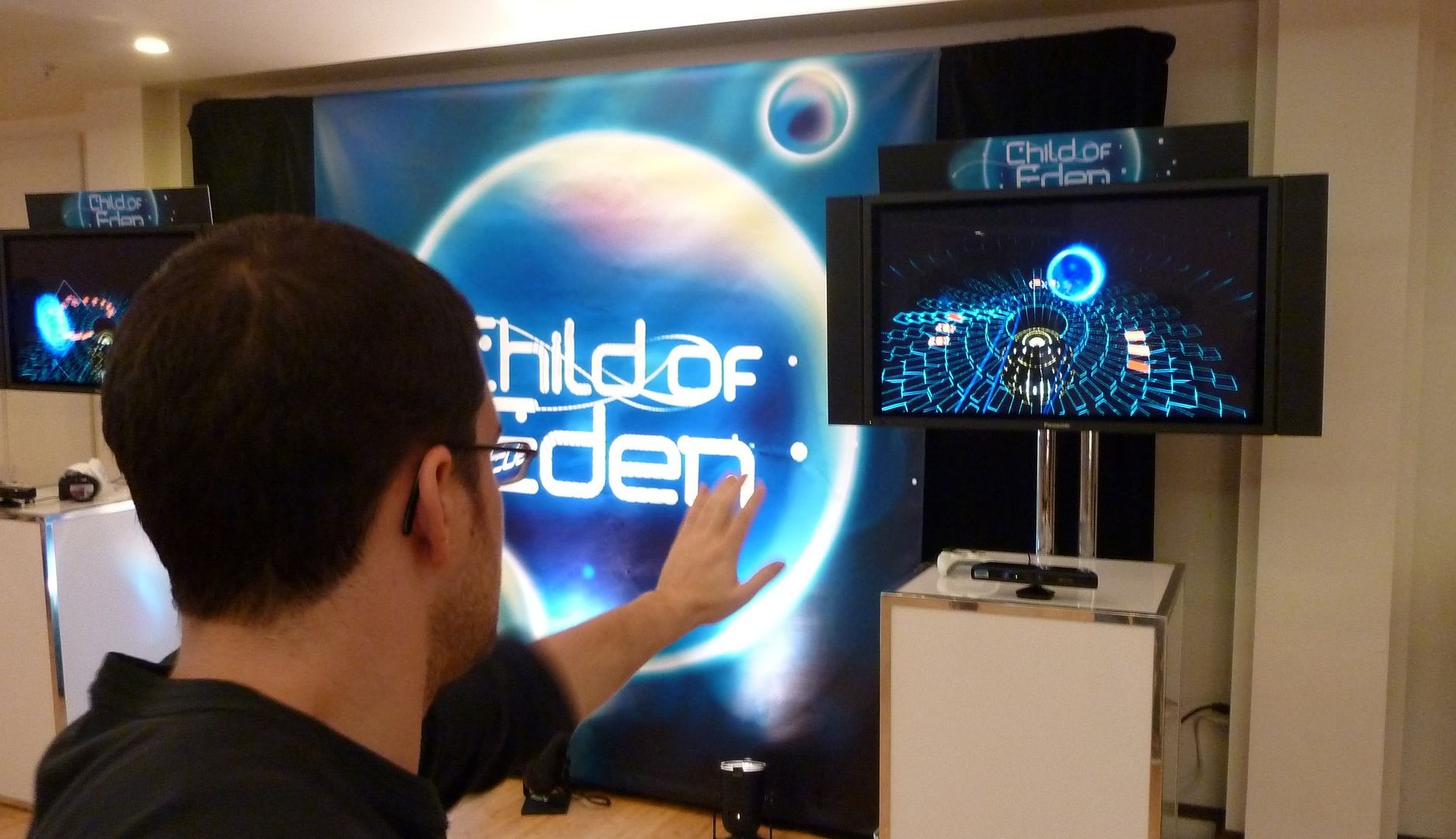 The second time's much better. Eden's a rail shooter with some camera control, but that hardly covers it. Mizuguchi has created a stunningly beautiful stream of consciousness, a pulsing geometric lightshow better seen than described, set to a driving techno-pop beat. Your empty hand guides a circular blue reticule: Glide over targets to lock on, then snap it at the screen to fire. A clap switches homing lasers to autofire. Controls feel a bit floaty, though I expect they'll tighten up. This very early version stutters and freezes regularly, and doesn't even have the HUD running yet. Grading on that curve, I'm seriously digging it.