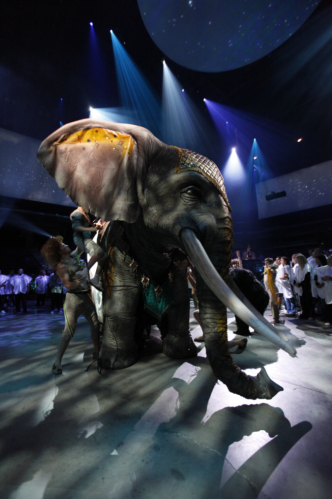 A (not real) elephant walks through the crowd, with a giant video display on its side. All grown up now, the wild child from The Road Warrior helps a young boy off the beast.