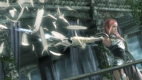 After the recap, we find Lightning kneeling at a throne in a castle while angel feathers fall from nowhere, because nothing says “melodramatic” like angel feathers (and no, they’re not coming from her feathery sash). Then, Lightning feels its necessary to walk out onto the balcony to reveal her new style (and make her sword appear out of feathers).