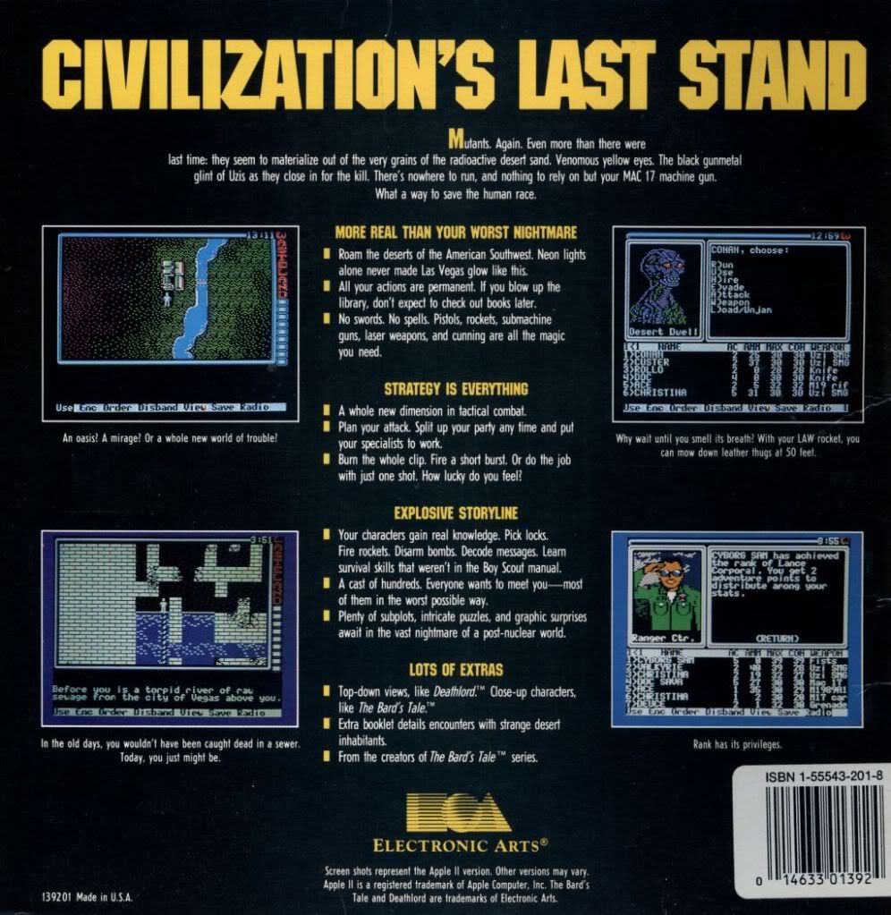 In '88, Interplay would go on to kick elves, dwarves, and orcs to the radioactive curb in Wasteland, a post-apocalyptic CRPG that shied away from swords and sorcery and replaced them with automatic weapons and a vast, player-customized skillset. Its minimalist looks and top-down tiled approach went against The Bard's Tale's first-person perspective, but the wide array of skills and open-ended depth of its gameplay more than made up for what it lacked on the surface, which provided ideas that would later be passed down to titles such as Fallout.