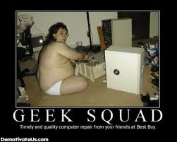 So, I took my phone into Geek Squad and after waiting in line for almost an hour to talk to someone, the guy told me that it could take up to 1 month to fix (Strike 1). He assured me, though, it shouldn't take that long; that it usually takes about 2 weeks tops because the repair center is right down the street. Hm mm.... Best Buy doesn't do in store repairs? Okay, so 2 weeks was okay I guess because it needed to be fixed. I asked for my temp. phone and they asked me for a 150.00 deposit for this temp phone! Um mm.... "but the cute little high school girl said I wouldn't have to pay anything for the temp. phone" (Strike 2). Ugh, I left my phone anyway hoping that it would only take the 2 weeks to fix since the repair center is, of course, right down the street. Well, today is the 21st of July and I still don't have my phone. I called them and the girl who answered told me that if my phone doesn't come in by the 28th (the date they promised me it would be back) that they would put in an escalation request for it to be repaired. Um... Strike 3. They are about out! What makes me cringe at this whole thing is, after Best Buy ganked my phone from me, I found out that if I took it into a Verizon repair center I would have got a whole new Droid 2 days later. http://itsgrindingmygears.blogspot.com/