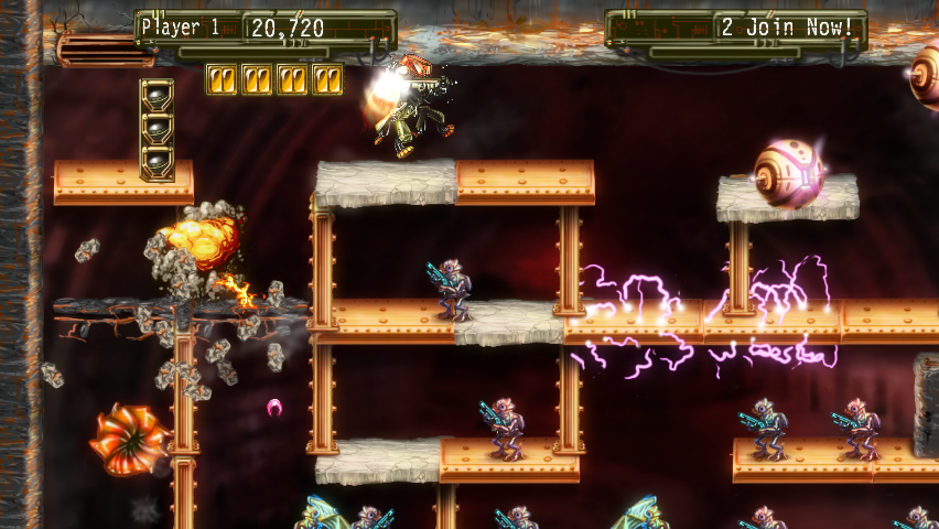 This morning I voted with my dollar and purchased Explosionade so I could give it a more thorough playthrough than the demo provided. Explosionade (along with Weapon of Choice) really give me that nostalgic feel, back to the 8-Bit days of the NES. While WoC put me in the mind of the classic Contra game, Explosionade reminds me of several classic games: Master Blaster, Turrican, Lode Runner, and Steel Battalion. This is certainly some very elite company, at least in my opinion.