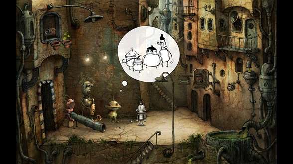 The next thing you'll notice about Machinarium is its method of storytelling. Specifically, you'll notice the complete lack of dialogue or written instruction. While this is certainly one of the elements that makes Machinarium so unique, it's also one of my most contentious issues with the game. Aside from menus and the title screen, there are no words in the game. Dialogue is presented as brief sketched animations that play out in thought bubbles. Even hints and tutorials are portrayed using sequential images. In many ways, this approach does a service; cheap voice actors could have ruined the whole experience, and indeed, any dialogue, no matter how well delivered or written, could have dealt serious damage to the whole aesthetic experience. On the other hand, most adventure games are boiling over with dialogue for a reason: it's a simple and effective way to inform the player.