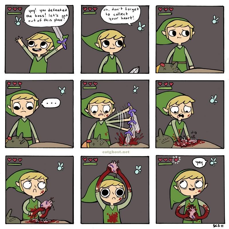 This darkly humorous comic reminds me of my first video-game conundrum: Is Link harvesting real hearts to sustain himself? Do the good people of Hyrule keep organs floating in jars next to their money?