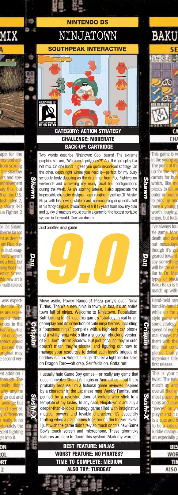 Point is, no way in hell Shoe and I could offer an unbiased review of Ninjatown. We’re too close to the story, dammit! So we did the only logical thing: Buried Ninjatown in a time capsule with instructions for the hyper-advanced ape civilization of 299X to timebeam the game and a DS back to EGM circa 1996 -- back to when Shawn, Shoe, and I were still game reviewers with no notion of Shawn’s future work. So easy, even a homo sapien can do it.